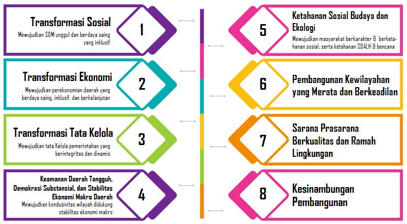 Visi pembangunan Jawa Tengah Sebagai Penumpu Pangan dan Industri Nasional yang Maju, Sejahtera, Berbudaya, dan Berkelanjutan pada tahun 2045 akan dapat terwujud melalui 8 (delapan) misi pembangunan daerah